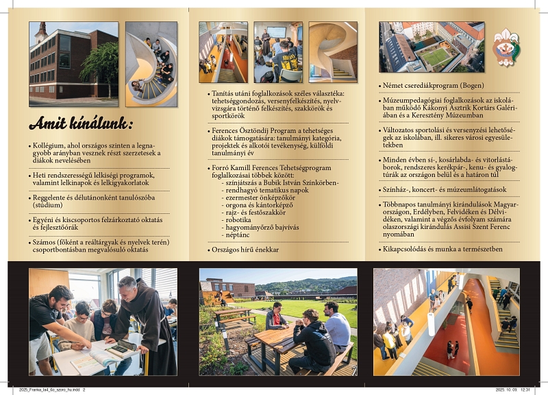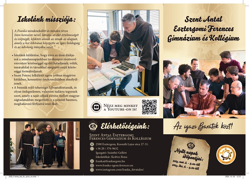 IT, TUDÁS, SZERETET – 1931 óta gimnáziumunk Szent Ferenc lelkületét követve végzi tanítói, nevelői hivatását. Szerzetesek, civil tanárok, dolgozók és kollégiumi nevelők együtt fáradoznak a diákok emberibb jövőjéért. Számunkra a nevelés növelést jelent!